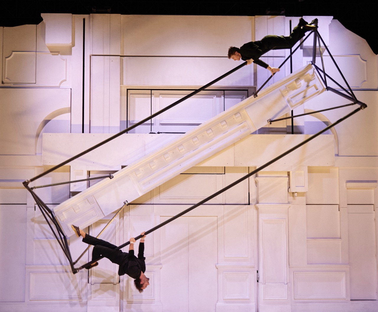 „Entre Chiens et Louves“ (Zwischen Hunden und Wölfen) enthüllt die Geschichten dreier Menschen, die in unterschiedlichen Epochen leben: 1870, 1960 und 2022. Der Hauptdarsteller Alex, aus dem Jahr 2022, taucht immer wieder in die Welten der Anderen ein und die Grenzen zwischen Realität und und Fiktion verschwimmen. Zu Beginn öffnen sich in der beeindruckenden Bühnenkulisse drei Wohnräume, aus den unterschiedlichen Epochen.